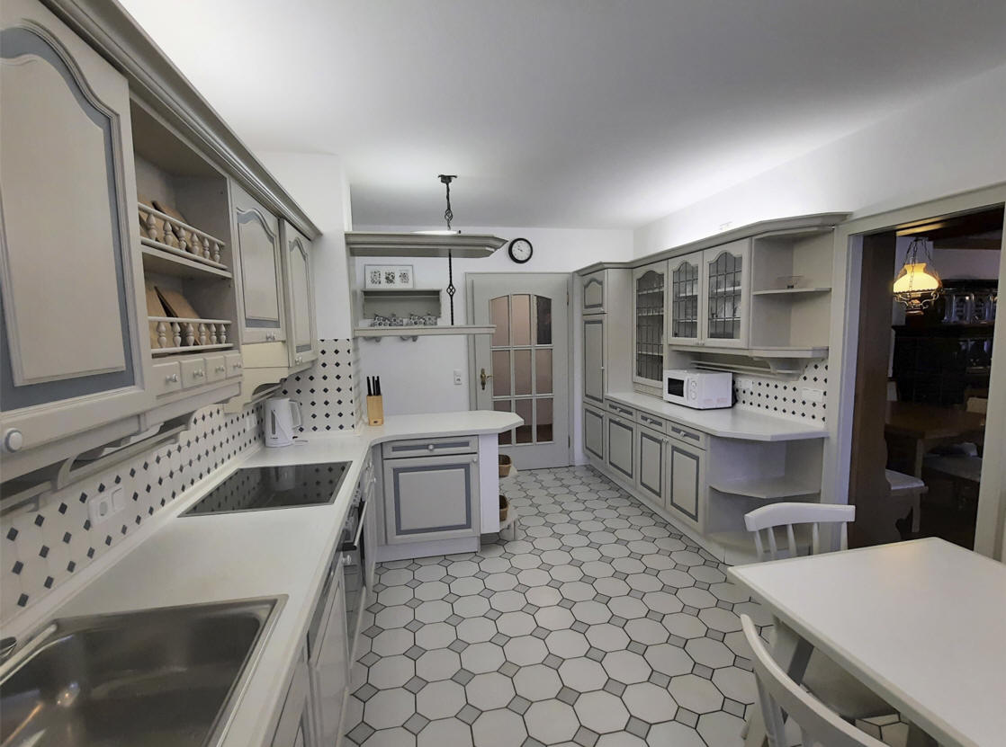 home is fully furnished and can accommodate up to 8 people. Almost all rooms are equipped with high-quality oak parquet, except for the bedroom on the upper floor, there is a high-quality carpet floor laid. A built-in kitchen is also available as well as a large tiled stove as additional heating and provides pleasant, cozy warmth. Wood for heating the stove (Kachelofen) can be found in the cottage next to the house. Room allocation: • Bedroom / master bedroom with double bed on the upper floor and private bathroom • Bedroom in the attic with double bed and private bathroom • Bedroom in the attic with double bed and pull-out day bed and private bathroom • Kitchen with dining area on the upper floor • Large living room with tiled stove and integrated dining table for up to 8 people • Entrance floors and spacious hallway on both floors During your stay a cleaning service is available on request for additional costs. |